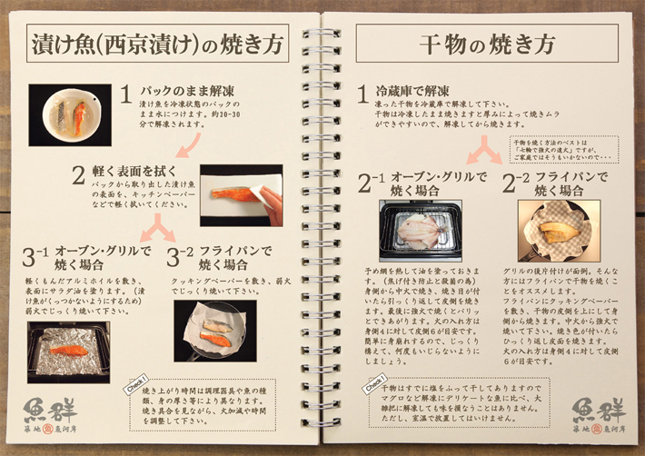 - 漬け魚(ぶり(国産)、赤魚(アメリカ)、銀鮭(チリ)、漬け床(白味噌、酒粕、砂糖、酒、みりん、焼酎))、干物(干しカレイ(北海道)、あじ(韓国他)、さば(宮城他)、食塩、酸化防止剤V.C.)