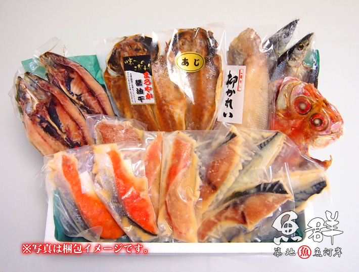 - ぶり120g×2枚、赤魚160g×2枚、銀鮭120g×2枚、かれい一夜干し1枚、あじの開き2尾パック、さばフィレ2枚パック