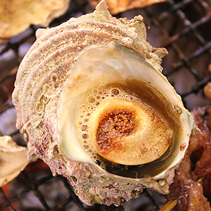 さざえといえばつぼ焼きです。網にのせ醤油をたらせばできあがり。さざえ独特の肝の苦味と身のコリコリした食感がたまりません。