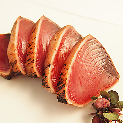 一本釣りかつおのたたきや炙りびんちょうまぐろを販売しています。魚の外側はカリッと焼きが入って中は生のままの状態です。解凍して切るだけで美味しいお刺身になります。